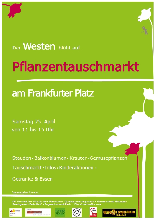 Wie in den vergangenen Jahren werden u.a. der Stadtgarten Bebelhof, der Garten ohne Grenzen und der Jugendumweltpark ihre Stände aufbauen. Daneben ist Platz für weitere Grün-Tausch-Angebote aus der Nachbarschaft. Ob sorgsam geplant oder spontan entschlossen – stellen Sie sich gerne dazu. Eine Anmeldung ist nicht erforderlich.