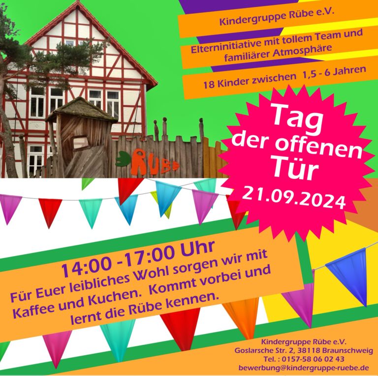 Am 21.09.2024 gibt es wieder eine Gelegenheit, die Kindergruppe Rübe e.V. kennenzulernen. Wir machen einen Tag der offenen Tür. Einlaß ist ab 14:00 Uhr.