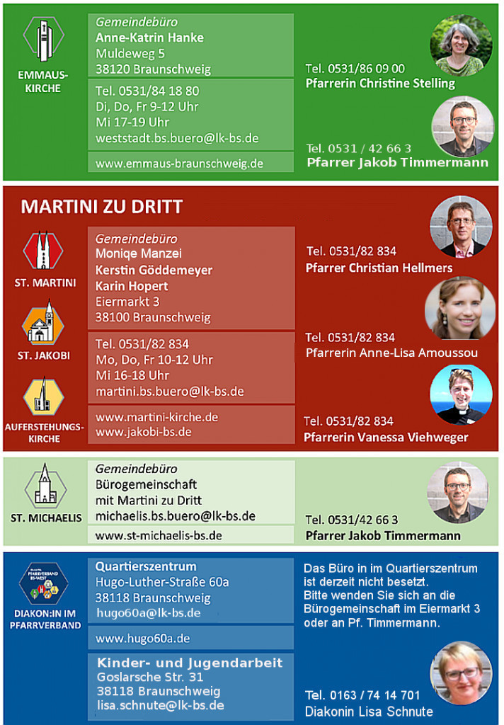 Die Arbeit der „Ev. Kirche im westlichen Ringgebiet“ wird von den kooperierenden Kirchengemeinden St. Martini, St. Michaelis, St. Jakobi, Emmauskirche und der Auferstehungskirche Gartenstadt getragen.